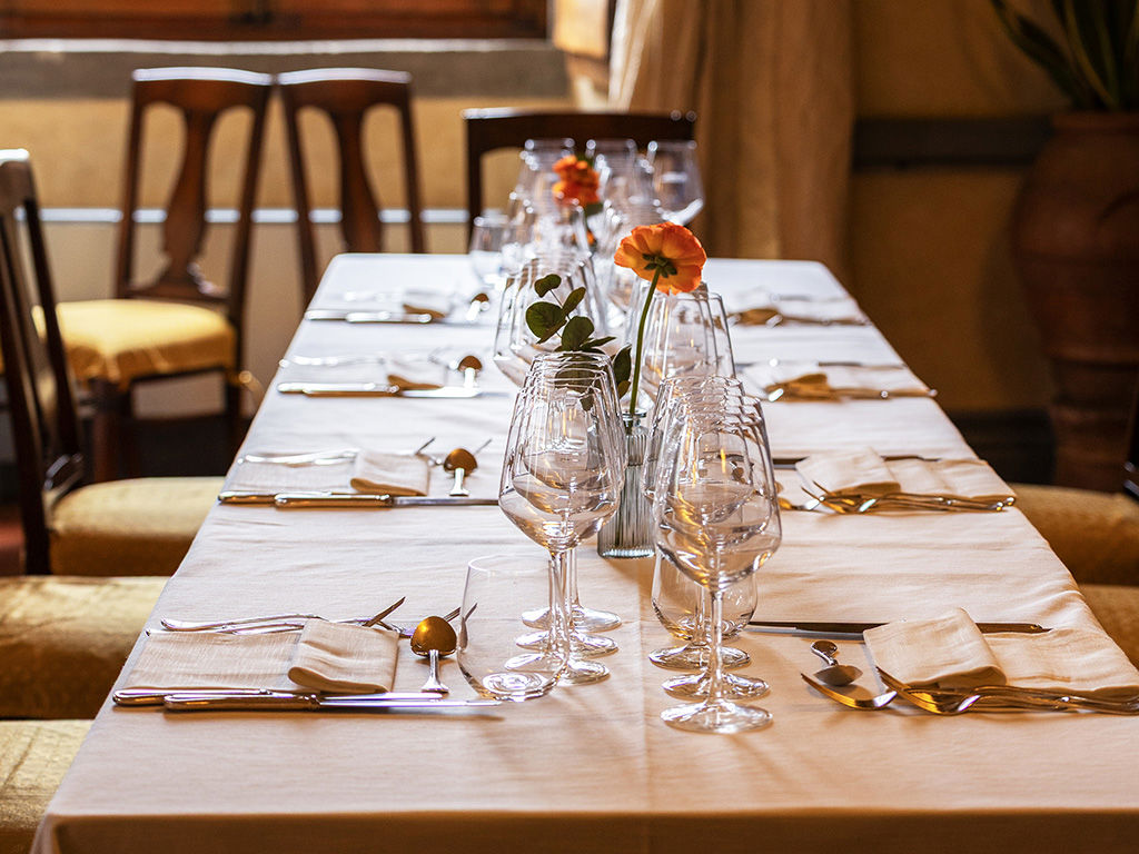 The interior welcomes guests into an elegant Renaissance hall, characterized by a vaulted ceiling that creates an evocative atmosphere. It is here that typical Tuscan dishes are served, prepared according to ancient recipes revisited with taste and refinement by the chefs.
